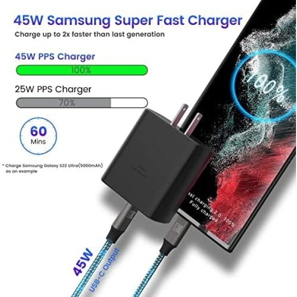 - What You Get – 2x Super Fast Charger Type C 45W Samsung, 2x 6.6ft Type C to Type C Charging Cord, 1x Welcome Guide, backed up by our worry-free 12-month warranty and 24/7 friendly customer service.