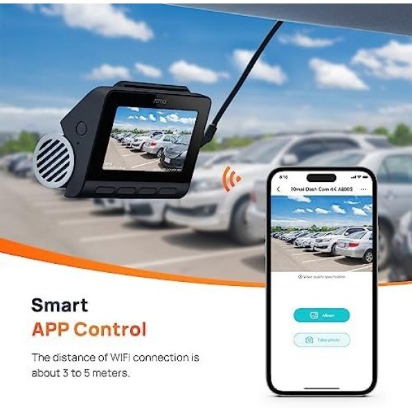 - In-app Control & Footage Sharing: Sharing is not a problem anymore with the dash cam 4K A800S, the 70mai App supports both iOS & Android systems, allowing you to view and download videos via Wi-Fi hotspot connection. In case of an accident, you can simply share the footage with your insurance provider for a more efficient claims process. Also, this function enables you to achieve continuous OTA updates by automatically fixing bugs and updating software