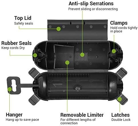 - FIRM AND TIGHT CONNECTION: Rubber seals at both ends conform well to the power cord; 2 clamps hold the cords tightly in place; adjustable anti-slip serrations keep the cords securely connected to prevent the plugs from sliding or disconnecting even if tug the cords in uses