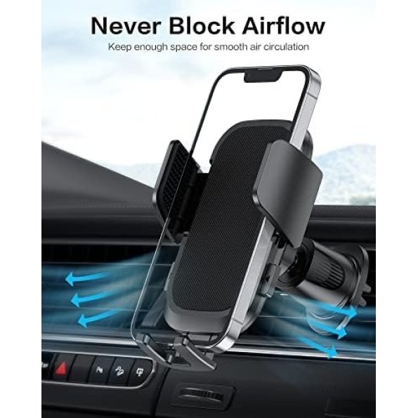 - Never Block Airflow: To avoid blockage of your car air vents, the phone holder car offers an extended arm, which is important for exceptional air circulation in your vehicle. As an added benefit, the holder has a phone charging port underneath.
