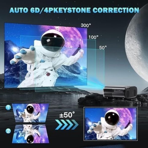 - [6D/4P AUTO KETSTONE & 100%-50%ZOOM ] GO1 outdoor projector can automatically adjust the screen to a rectangle with built-in sensor and 6-way gyroscope, even when it’s moving! 100%-50% zoom adapts to different screen sizes without compromising image quality, which makes this portable video projector is ideal for office meeting, home movie theater and school presentations.