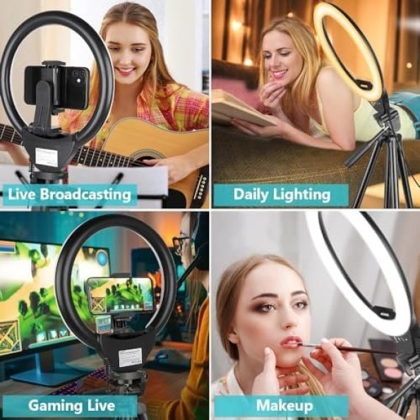 - Fully customizable portable tripod Stand: Extending from 15.7 inches to 50 inches, our tripod can be adjusted to any height within seconds as needed, short enough to stand on tabletop, tall enough to fit your height. This compact circle light set comes handy when you do makeup, artworks, beauty & fashion live streaming, video calls and more.